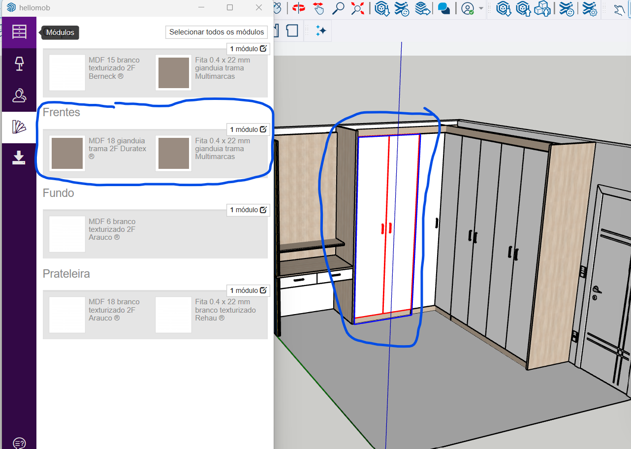 Estou tentando mudar a cor das portas e frentes do móvel mas ele só muda na biblioteca porem no visual do 3D não muda.